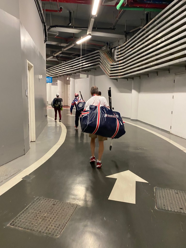 Yesterday kicked off the official competition for our team and for the Games. We played our first game against Team Israel. They were an interesting squad comprised of mostly Russians and Canadians. Supposedly, their team captain is an orthodox rabbi from Toronto. Regardless, he was one of the best players on the ice! We fell behind 1-0 in the first period despite carrying the play. In the second period, we exploded for 4 goals and went on to win 7-3. For those who remember the Hartford Whalers, the PA announcer played “Brass Bonanza” after several of our goals. It was like a voice from God! I got in the game for part of the third period. It was great to make a few stops and contribute to the win. Side note for those diehards who watched some of the game: our two players thrown off for “fighting” in the third period will be eligible for our next game versus the EU. Yes, a small fracas broke out after one of the Israeli players took a cheap shot on one of our players against the boards in the corner! So much for peace and the goodwill mission even amongst the Jews! Team Israel was a chippy team that was very aggressive with their sticks, elbows and hands to say the least!