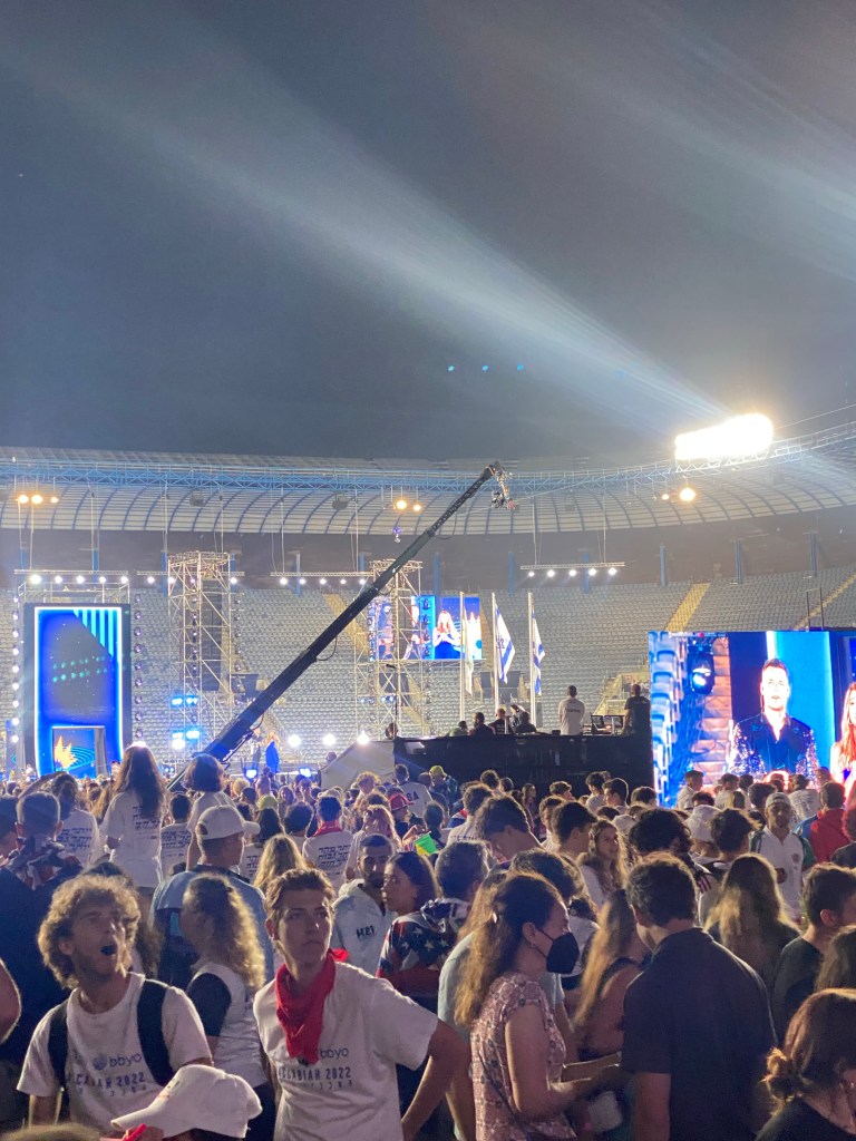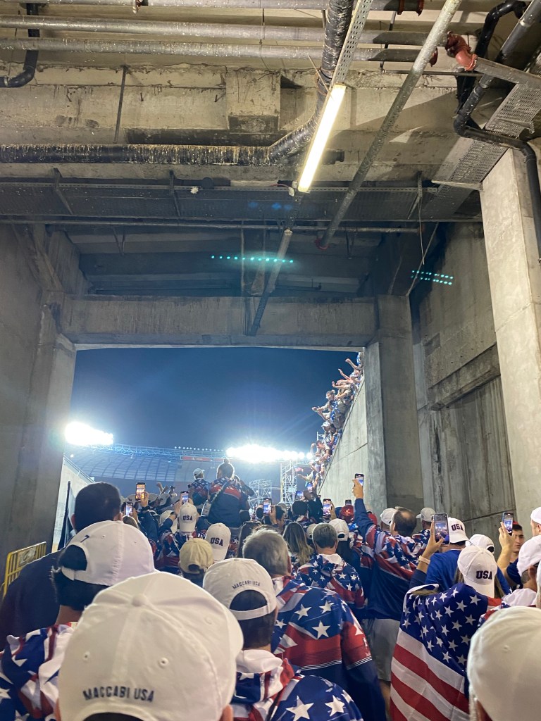 After coming back to the hotel for lunch, we turned right around and went back to the arena which was being used for athlete staging for the opening ceremonies later in the evening. It was pretty awesome to see the arena we played in that morning filled with all 10,000 athletes from countries around the globe including atypical “Jewish countries” such as Ireland, India, and Cayman Islands. The US has 1,300 athletes here. Israel has slightly more. Large delegations also came from Argentina, Brazil, England and Australia. There is a women’s volleyball team from the Ukraine as well. They got a standing ovation from all of the athletes when they were announced which was pretty awesome.