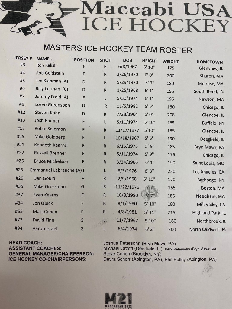 A journal of my 2022 Maccabi Masters Men’s Ice Hockey experience